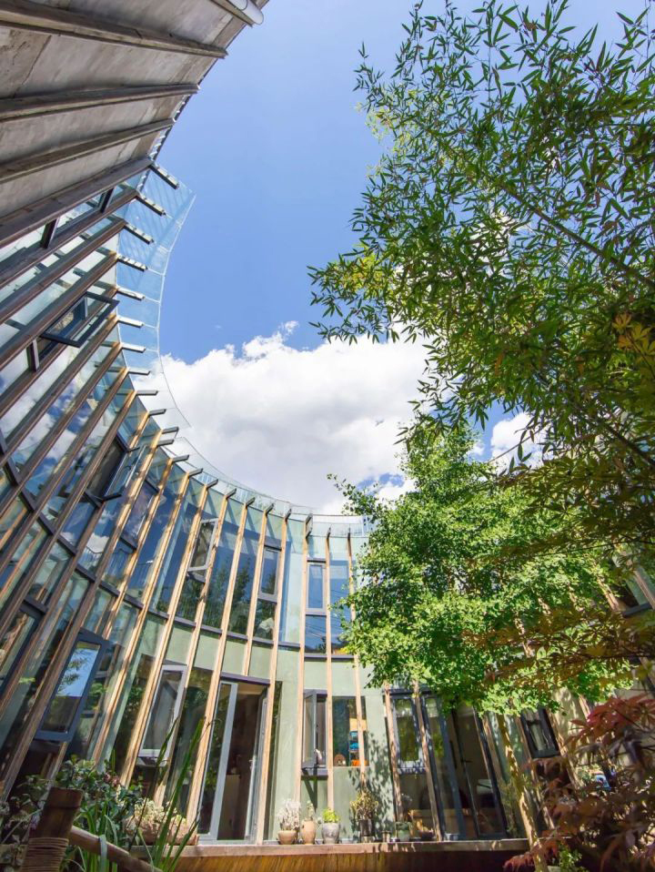 Ngôi nhà của gia đình nằm trong ngõ nhỏ với tường ngoài màu xám, câu đối đỏ, không khác nhiều những ngôi nhà xung quanh. Nhưng khi cổng được mở ra, đó là một thế giới hoàn toàn khác biệt. Một sân tròn, có hàng tre, bộ bàn trà nằm trên thảm cỏ xanh mướt, dòng suối nhỏ róc rách và cây ngân hạnh xanh um tùm.
