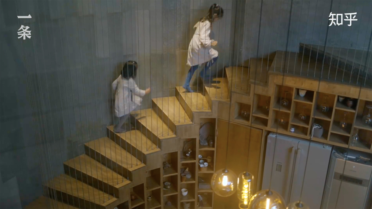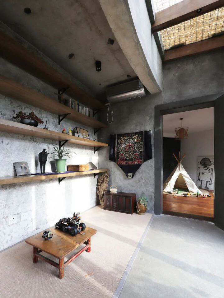 Ngay sảnh tầng hai có một phòng sinh hoạt của trẻ em với bốn chiếc bàn có độ cao khác nhau. Đây là không gian có thể thỏa mãn cùng lúc sở thích của cả cha mẹ và con cái. Người cha thường ở đây cùng con trai lớn viết thư pháp, hai con gái nhỏ vẽ tranh.