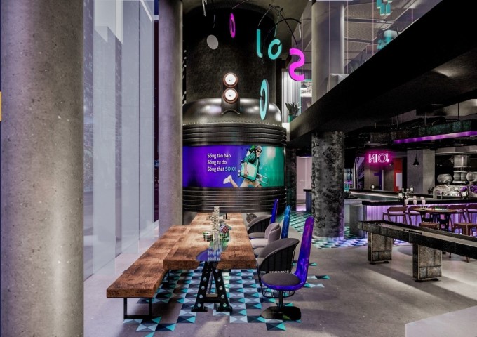 Khu vực check-in kết hợp quầy bar mang phong cách Industrial (kiến trúc đậm chất công nghiệp) cùng những mảng tím đặc trưng, tạo nên sự hứng khởi cho khách lưu trú.